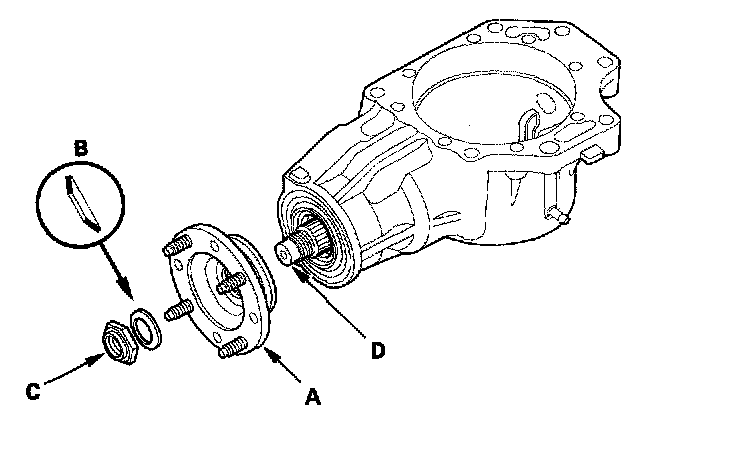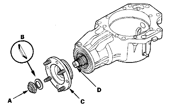 7. Install the companion flange (A), conical spring washer (B) in the direction shown, and locknut (C) on the transfer output shaft (hypoid gear) (D). Do not install the O-ring and back-up ring on the transfer output shaft.