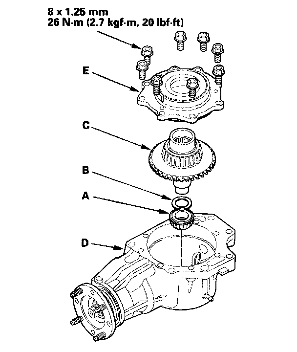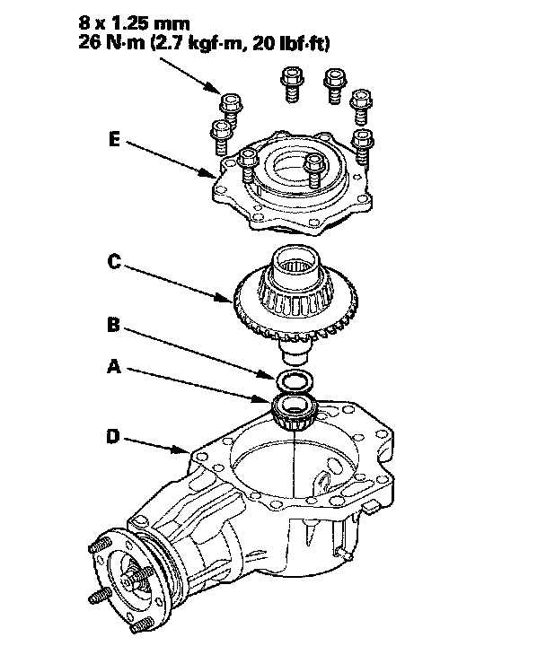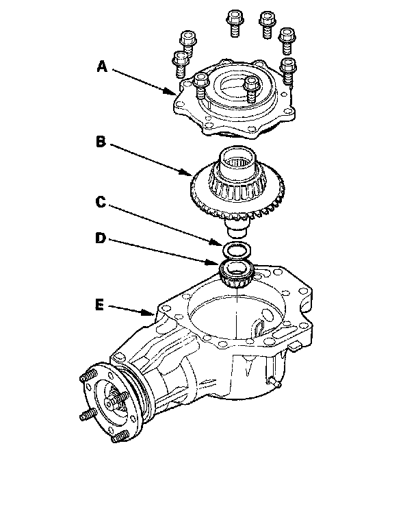 19. Remove the transfer cover (A), transfer hypoid drive gear/shaft assembly (B), 25 mm thrust shim (C), and tapered roller bearing (D) from the transfer housing (E) after adjusting the transfer gear backlash or transfer gear tooth contact.