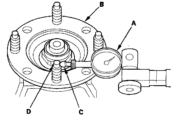 14. Set a dial indicator (A) on the transfer companion flange (B); position the dial indicator tip (C) on the top of the bolt (D).