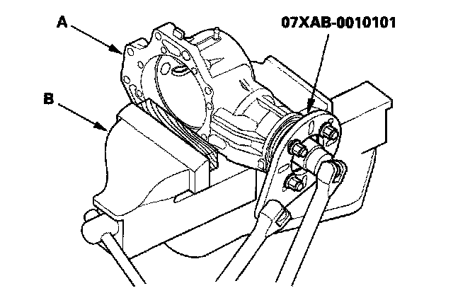 20. Secure the transfer housing (A) in a bench vise (B) with soft jaws, then install the special tool on the companion flange. To prevent damage to the transfer housing, always use soft jaws or equivalent materials between the transfer housing and the vise.