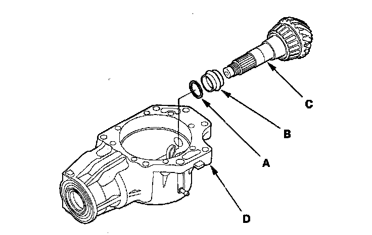 23. Install the thrust washer (A) and the new transfer spacer (B) on the transfer output shaft (hypoid gear) (C), and install them in the transfer housing (D).