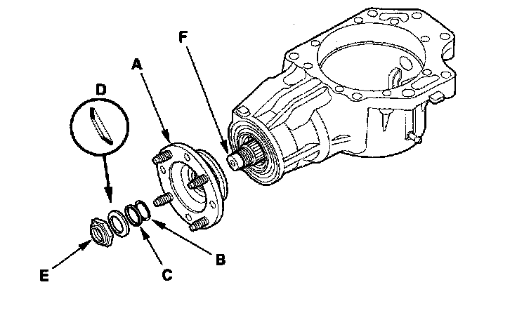 25. Install the companion flange (A). Coat a new O-ring (B) with transfer fluid (hypoid gear oil), then install the O-ring, back-up ring (C), new conical spring washer (D), and new locknut (E) on the transfer output shaft (hypoid gear) (F). Install the conical spring washer in the direction shown.
