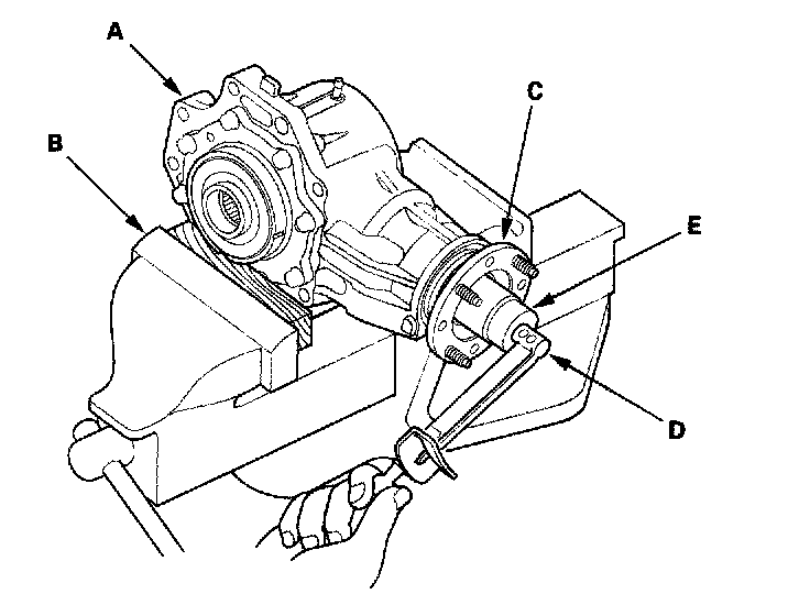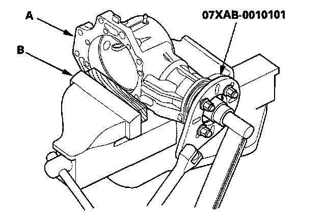 8. Secure the transfer housing (A) in a bench vise (B) with soft jaws, then install the special tool on the companion flange. To prevent damage to the transfer housing, always use soft jaws or equivalent materials between the transfer housing and the vise.