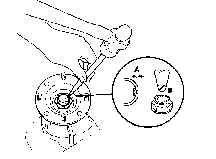 29. Stake the locknut in depth (A) of 0.7 - 1.2 mm (0.03 - 0.05 inch) using a 3.5 mm punch (B).
