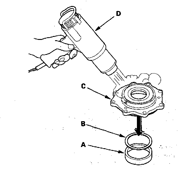 30. Install the tapered roller bearing (A), 25 mm thrust shim (B), and transfer hypoid drive gear/shaft assembly (C) in the transfer housing (D).