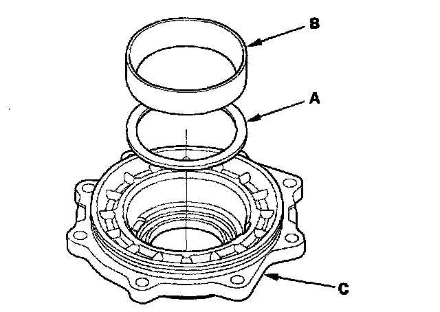 38. Install the 80 mm trust shim (A) and the bearing outer race (B) in the transfer cover (C). If you heated the cover, let it cool to room temperature before installing the thrust shim.