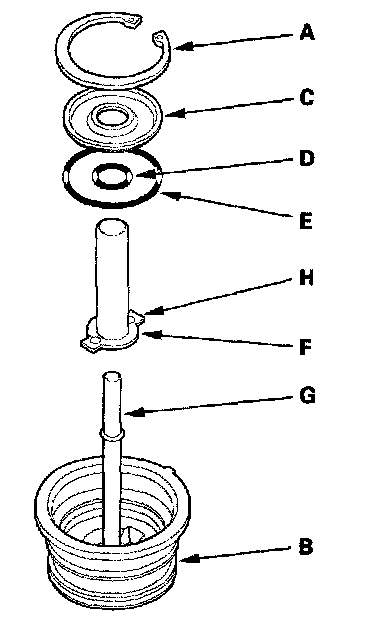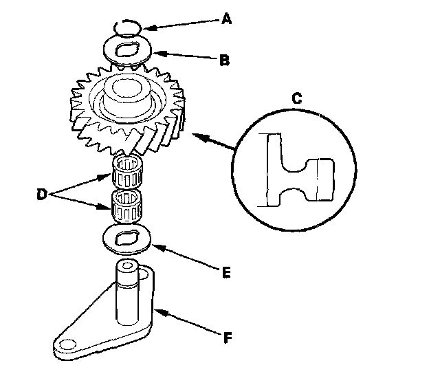 1. Remove the snap ring (A), then remove the thrust washer (B), reverse idler gear (C), needle bearings (D), and thrust washer (E) from the reverse idler gear shaft/holder (F).