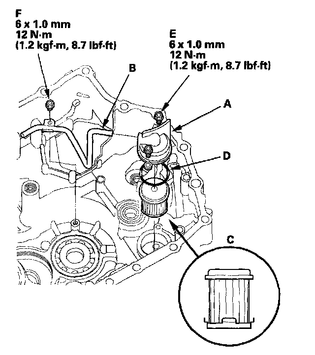 5. Secure the ATF filter cover with the two bolts (E), then secure the ATF pipe with the bolt (F).