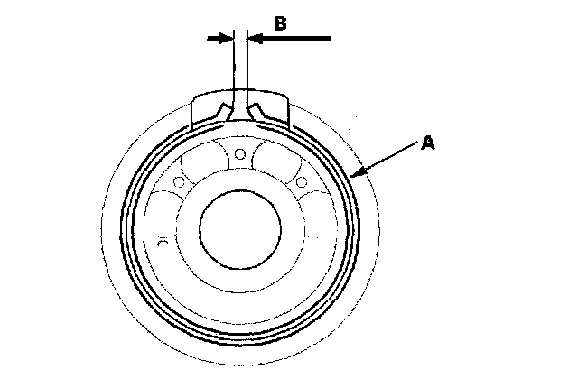 4. After installing the bearing, verify that the snap ring (A) is seated in the bearing and housing groove, and that the ring end gap (B) is 0 - 7 mm (0 - 0.28 inch).