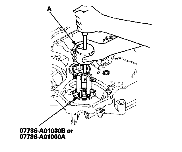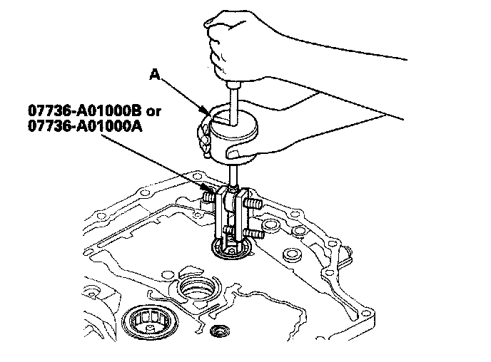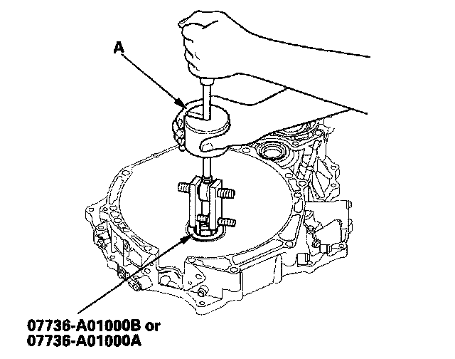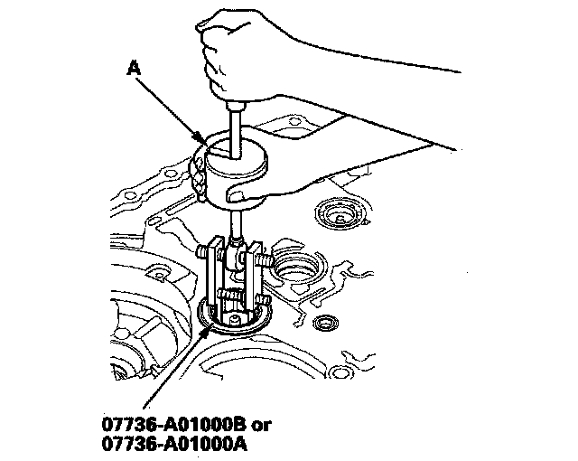 1. Remove the mainshaft bearing and oil seal with the special tool and a commercially available 3/8 16 slide hammer (A).