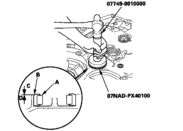 3. Install the bearing (A) in the housing with the special tools; install bearing outer notch-cut (B) in depth (C) of 0-0.03 mm (0-0.001 inch) below the housing surface (D).