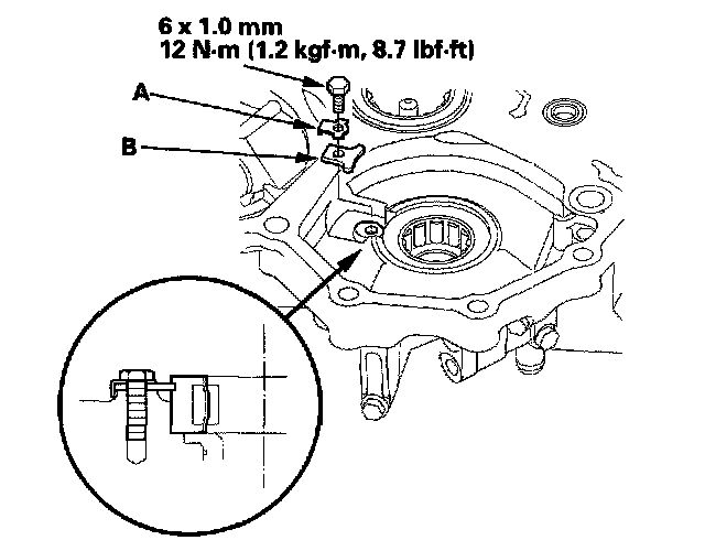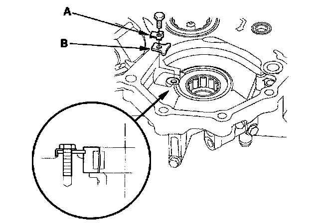 1. Remove the bolt, then remove the lock washer (A) and bearing set plate (B).