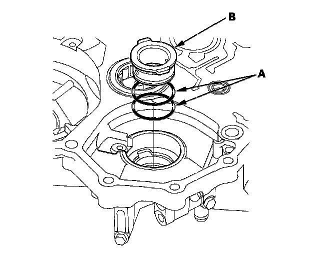 6. Install the new O-rings (A) on the ATF guide collar (B), then install the guide collar in the torque converter housing.