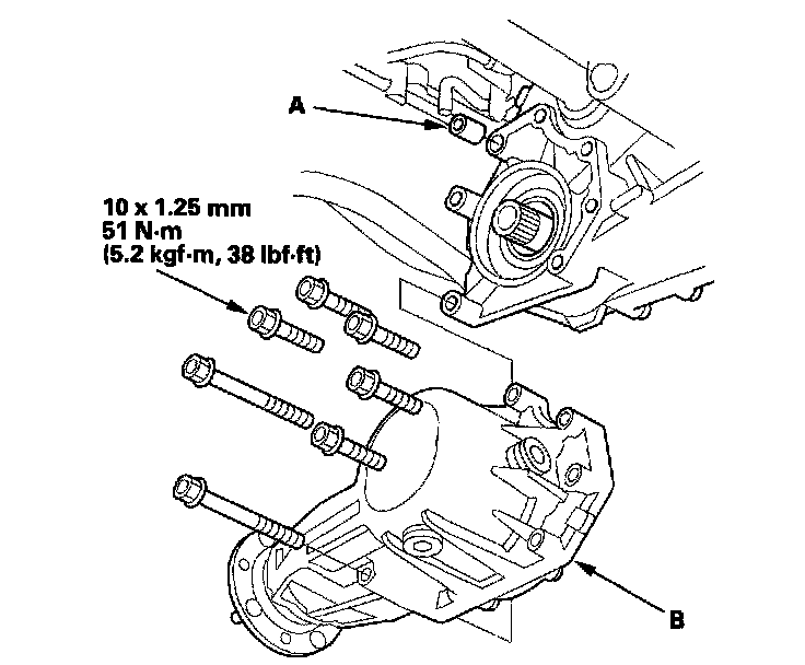 2. Install the dowel pin (A) in the transmission, and install the transfer assembly (B) on the transmission.