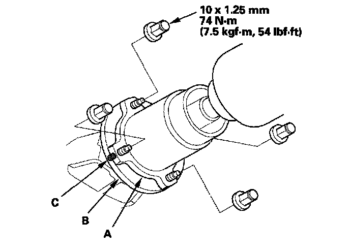 3. Install the propeller shaft (A) to the transfer companion flange (B) by aligning the previously made reference mark (C).