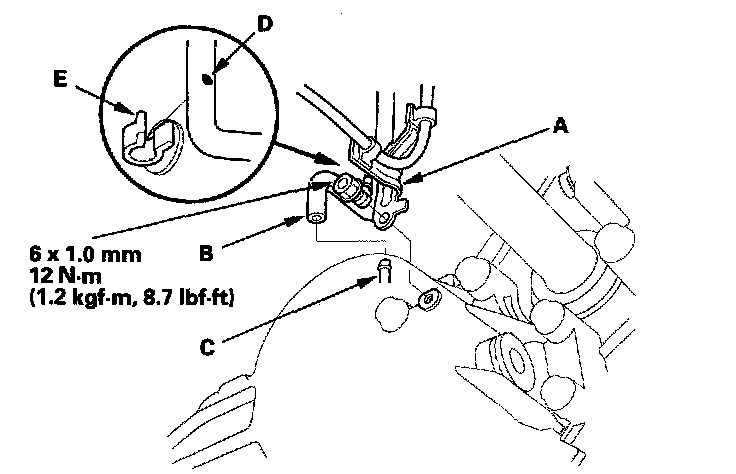 4. Secure the transfer breather tube bracket (A) on the transfer assembly with the bolt, and install the breather tube (B) over the breather pipe (C). If the breather tube was removed from the clamp, install the tube at the dot (D) on the clamp (E).