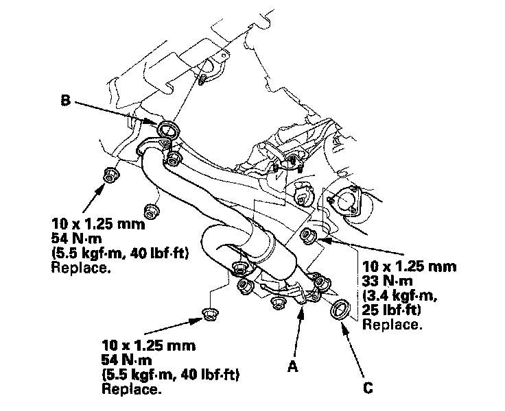 5. Install exhaust pipe A with the new self-locking nuts and new gaskets (B) (C).