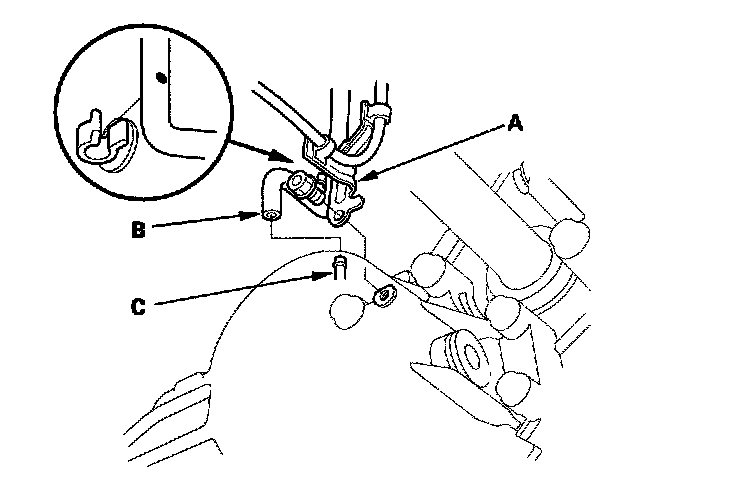 6. Remove the bolt securing the transfer breather tube bracket (A), and disconnect the breather tube (B) from the breather pipe (C) on the transfer assembly.