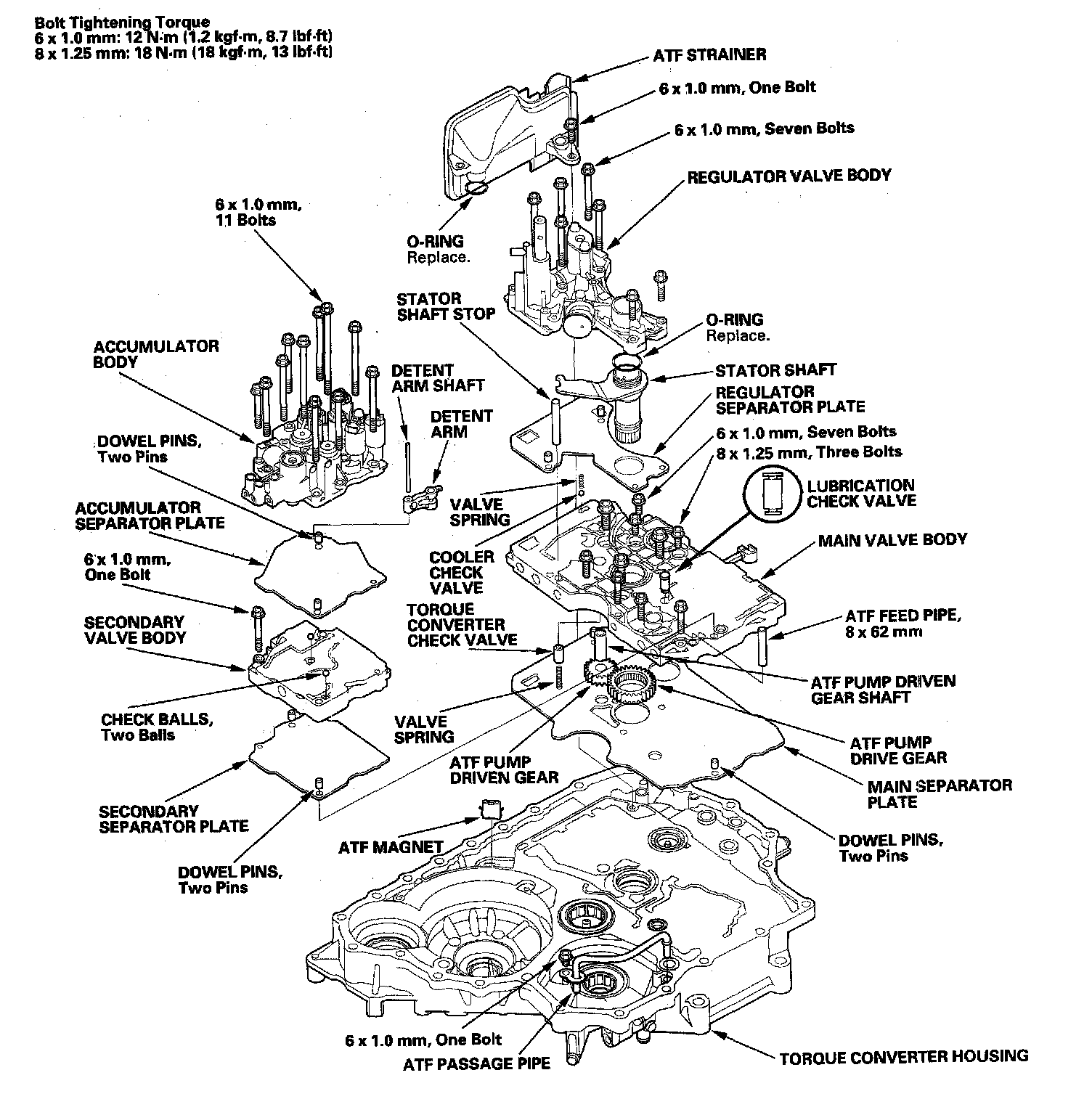 11. Install the 8 x 62 mm ATF feed pipes in the main valve body, and install the accumulator body (11 bolts).
