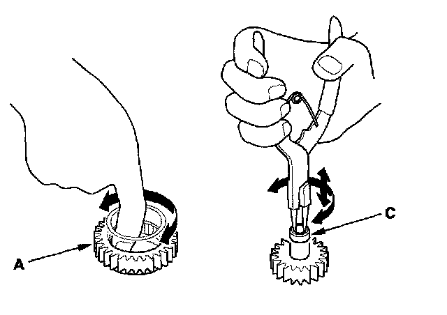 4. Install the main valve body (seven 6 mm bolt and three 8 mm bolts). Make sure the ATF pump drive gear (A) rotates smoothly in the normal operating direction, and the ATF pump driven gear shaft (C) moves smoothly in the axial and normal operating direction.