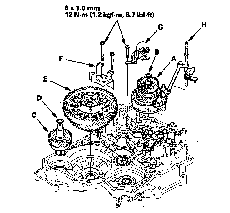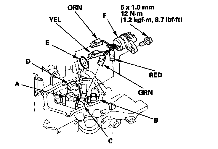 74. Install the connector bracket (F), and secure the ATF lines with the 6.0 mm bolt (G) on the transmission housing. Tighten the bolts to 12 Nm (1.2 kgf-m, 8.7 ft. lbs.).