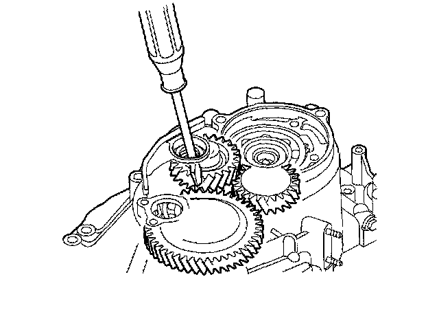 35. Wrap a screwdriver tip with tape to prevent damage to the reverse idler gear teeth. Engage the reverse idler gear with reverse gears by rotating the idler gear using the screwdriver.