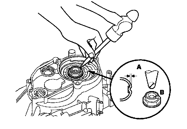 27. Secure the shift fork (A) to the shift fork shaft with the lock bolt and the new lock washer (B), then bend the lock tab of the lock washer against the bolt head.