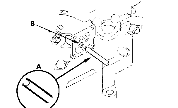 17. Install the intermediary shaft (A) into the main valve body, and install the 26.5 mm washer (B) on the top of the intermediary shaft.