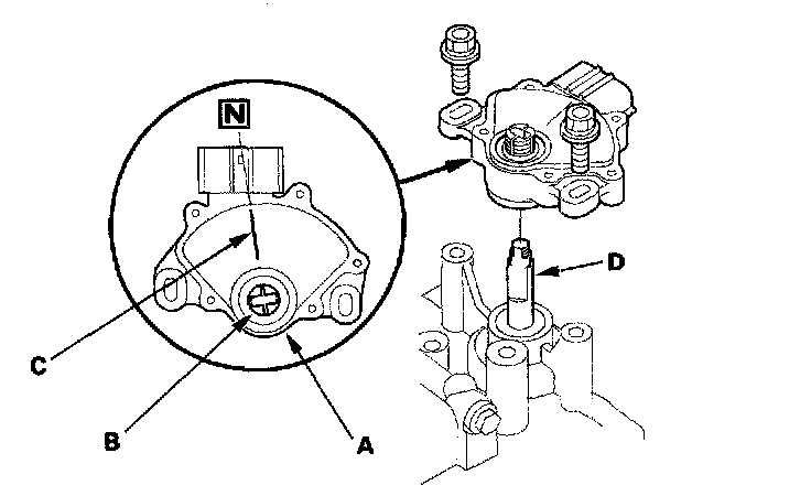 63. Set the transmission range switch (A) to the N position. The transmission range switch clicks in the N position, and the selector control shaft hole (B) aligns with the N positioning line (C).