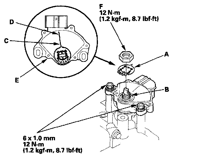 65. Install the new lock washer (A) over the selector control shaft (B) with aligning the projection (C) of the lock washer with the N positioning line (D) on the transmission range switch (E), and install the locknut (F).