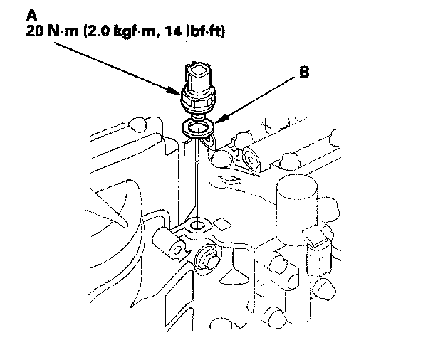 71. Install the 4th clutch transmission fluid pressure switch (A) with the new sealing washer (B). Tighten the switch with the metal part.