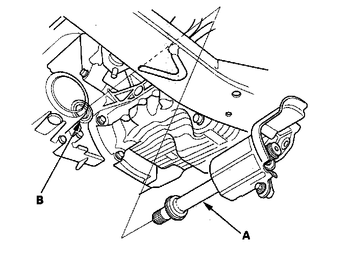5. Remove the intermediate shaft (A) from the differential. Hold the intermediate shaft horizontal until it is clear of the differential to prevent damage to the differential oil seal (B).