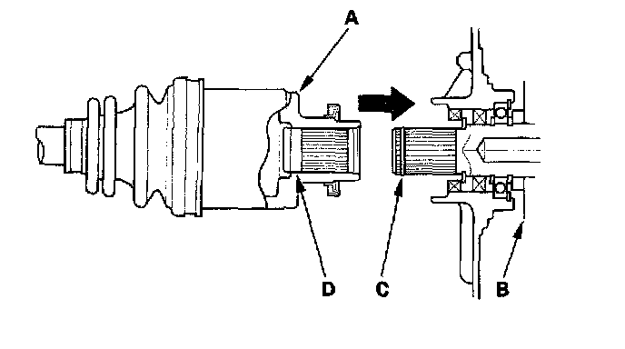 4. Clean the areas where the driveshaft contacts the differential thoroughly with brake cleaner, and dry with compressed air. Do not wash the rubber parts in solvent. Insert the inboard end (A) of the driveshaft into the differential (B) until the set ring (C) locks in the groove (D).