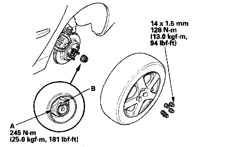 7. Install a new spindle nut, then torque the nut. After tightening, use a drift to stake the spindle nut shoulder against the driveshaft (B).