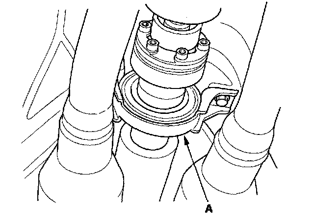 3. Check the center support bearing (A) for excessive play or rattle. If the center support has excessive play or rattle, replace the propeller shaft assembly.