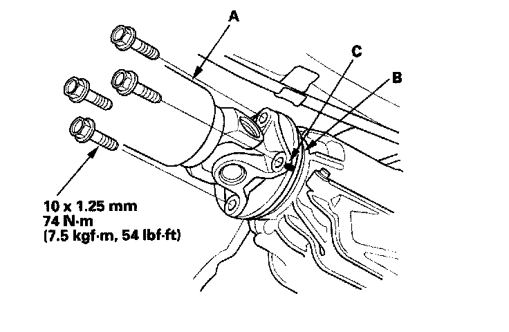 3. Install the propeller shaft (A) onto the rear differential companion flange (B) by aligning the reference marks (C) you made. Make sure you use new mounting bolts.