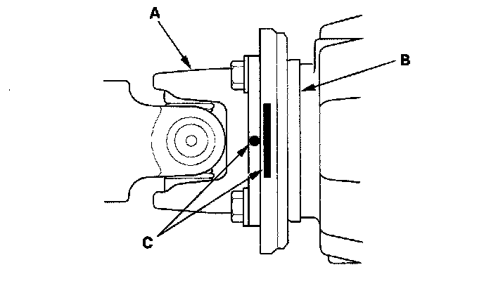 NOTE: When replacing the propeller shaft (A) or the rear differential (B), align the factory reference marks (C).