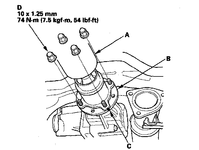 4. Install the propeller shaft (A) onto the transfer companion flange (B) by aligning the reference mark (C). Make sure you use new mounting nuts (D).
