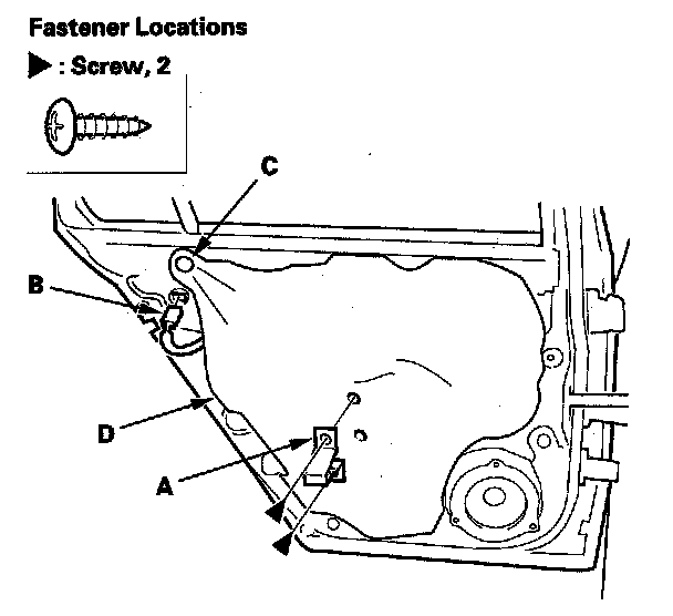 2. Remove the screws, then remove the door ashtray bracket (A). Disconnect the latch actuator connector (B), and remove the cap (C), and then remove the plastic cover (D).