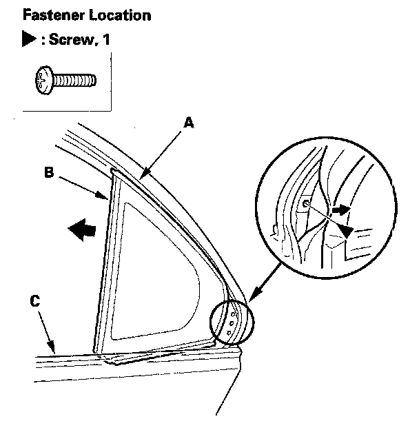 6. Pull the door weatherstrip (A), and remove the screw, then remove the quarter glass (B). Take care not to damage the outer weatherstrip (C).