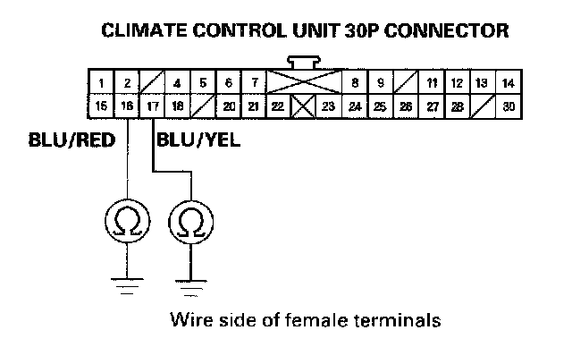 13. Check for continuity between the No. 16 and No. 17 terminals of the climate control unit 30P connector and body ground individually.