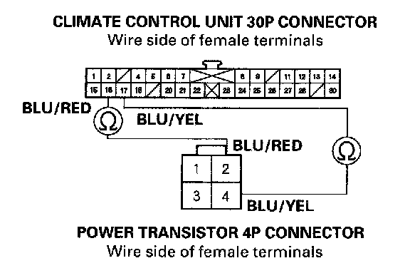 14. Check for continuity between the following terminals of the climate control unit 30P connector and power transistor 4P connector.