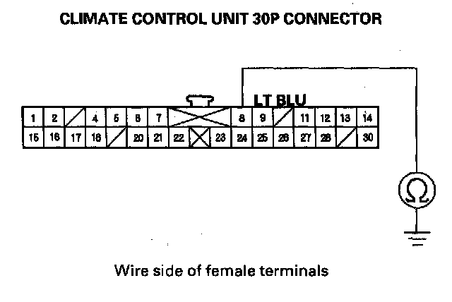 4. Check for continuity between the No. 8 terminal of the climate control unit 30P connector and body ground.
