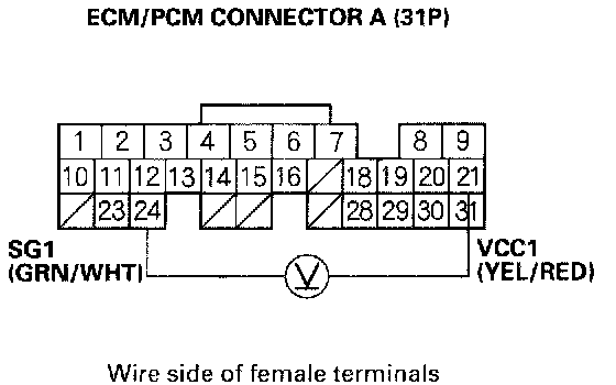 14. Measure voltage between ECM/PCM connector terminals A21 and A24.