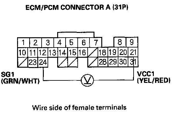 7. Measure voltage between ECM/PCM connector terminals A21 and A24.
