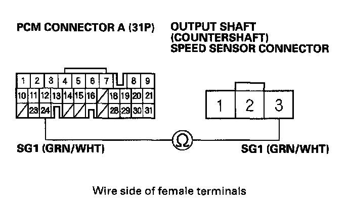 17. Check for continuity between PCM connector terminal A24 and output shaft (countershaft) speed sensor connector terminal No. 3.