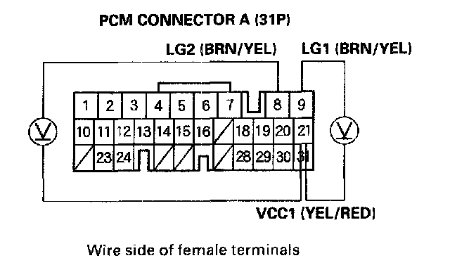 30. Measure the voltage between PCM connector terminals A18 and A8 or A9.
