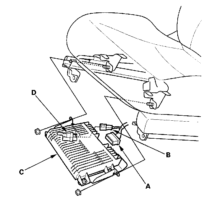 3. Disconnect the front stereo amplifier 26P connector (A) and rear stereo amplifier relay 4P connector (B) from the front stereo amplifier (C) and rear stereo amplifier relay (D).