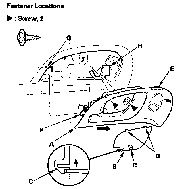 5. Disconnect the inner handle cable (G) and power door lock switch connector (H).
