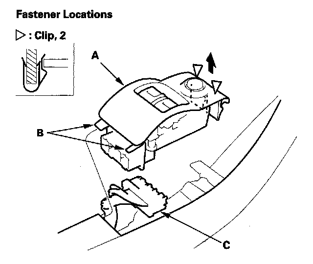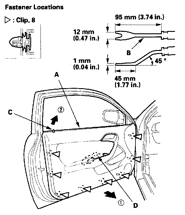 6. Release the clips that hold the door panel (A) with a commercially available trim pad remover (B), then remove the door panel by pulling it upward to release it from the lock knob (C) and door. Remove the door panel with as little bending as possible to avoid creasing or breaking it. Detach the harness clip (D) from the door panel.